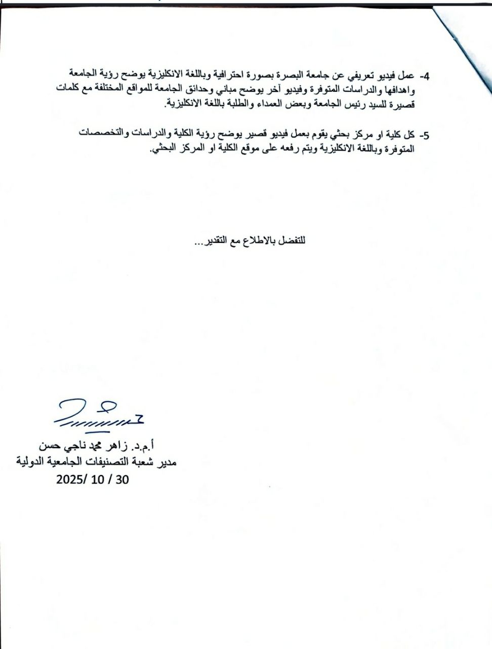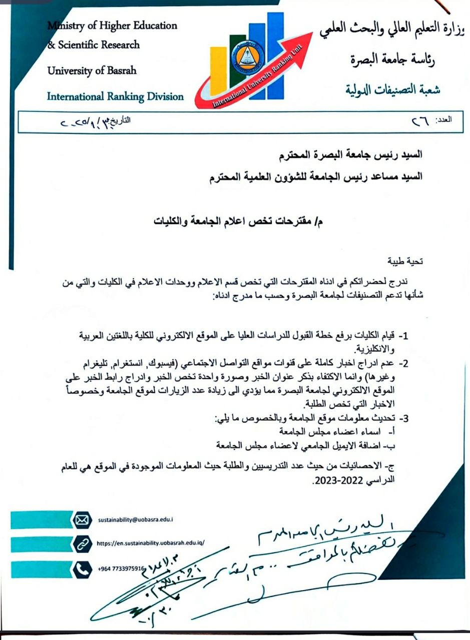 استنادًا إلى توجيهات السيد رئيس الجامعة المحترم، وبالاطلاع على مطالعة شعبة التصنيفات الدولية ، يرجى التقيّد بما ورد فيها والمتعلق ب، وانتقاء التعليمات المطلوبة و الأنشطة والفعاليات التي تسهم في دعم وتعزيز التصنيف العالمي لجامعتنا.