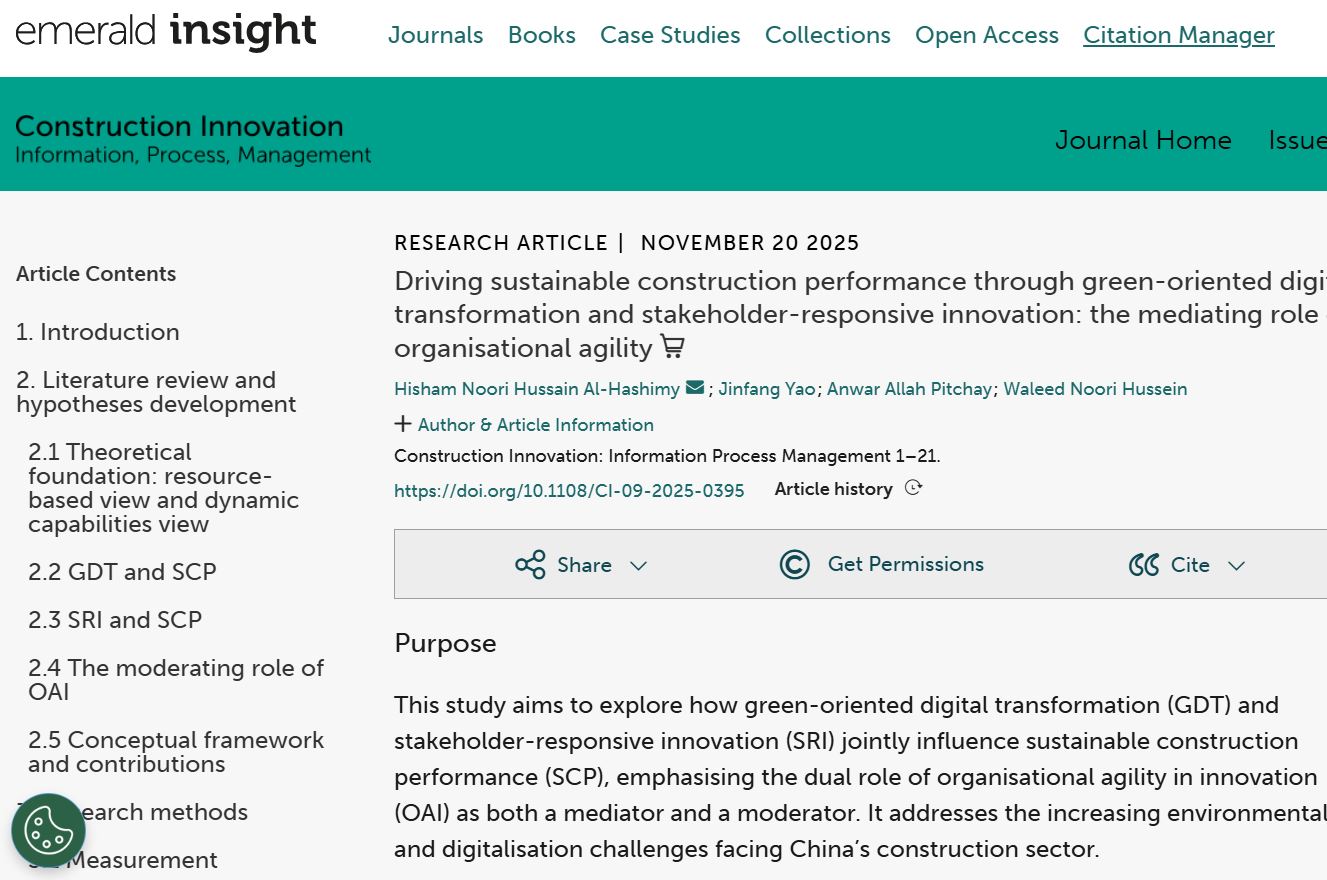 نشر التدريسي في كلية طب الزهراء الاستاذ المساعد الدكتور وليد الهاشمي بالتعاون مع باحثين من الصين وماليزيا يحثا علميا بعنوان "Driving sustainable construction performance through green-oriented digital transformation and stakeholder-responsive innovation: the mediating role of organisational agility" ضمن الربع الاول Q1 في WoS ,وضمن سكوبس في دار النشر العالمية Emerald
